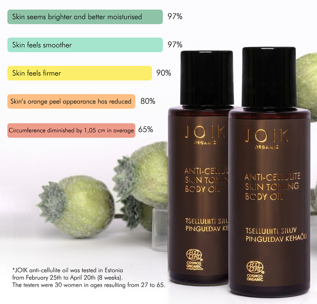 Summer is not far and it’s time to tackle cellulite. Last year we carried out a thorough 2-months survey and here are the results. If you want to skip straight to great offers, find them at the end of this blog. You have enough time for thorough treatment before summer arrives. To summarize, JOIK Organic Anti-Cellulite Oil was rated very positively by the testers and the effect of the product has been proven by people’s evaluations.
